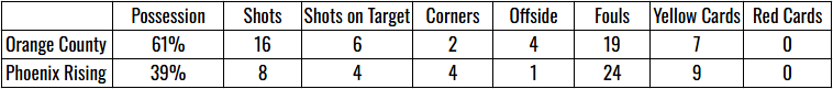 Orange County held the ball for long stretches of time but Phoenix was able to greatly limit the number of dangerous chances. They would do so by playing a high line and by committing a ton of fouls. This will be a common theme throughout this game. Phoenix in the first half of the game committed 11 fouls and they were at opportune times. One of the underrated strengths of OC was their ability to limit big opportunities for the most part. So the shock of it when a back pass to Rando gets by him and was tapped in by Studdenhofft to make it 0-1 to Phoenix in the 35th minute was very real.